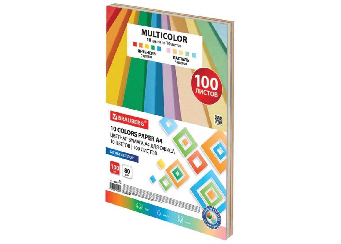 - Бумага Brauberg 115350 MULTICOLOR А4, 80 г/м2, 100 л. (10 цветов x 10 листов)