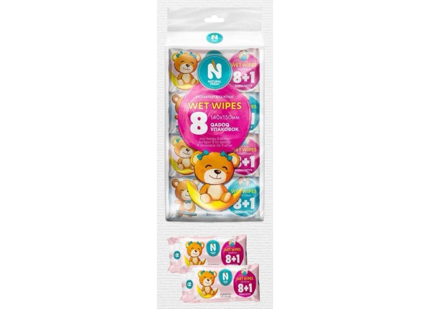 - Влажные салфетки 9шт Natural Fresh в спайке 8шт.Розовые/Голубые