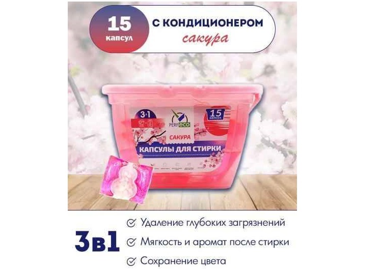 - Стиральный порошок Капсулы Perfeco 15шт.10гр. 3в1 Сакура