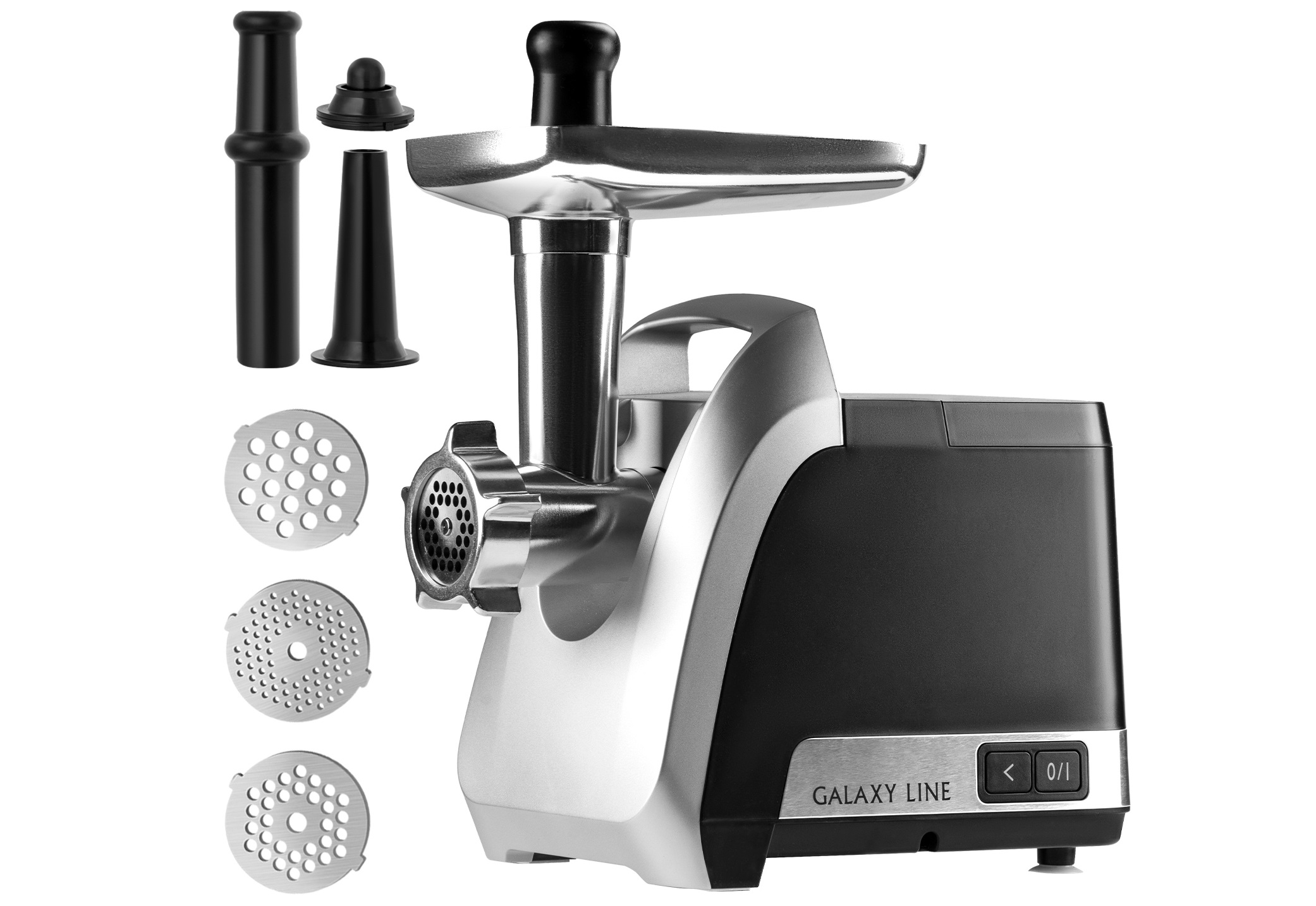 Мясорубка электрическая Galaxy LINE GL 2422, черный, 2200 Вт, производительность 2,6 кг/мин, функция «Реверс», металлический лоток, 3 диска для приготовления фарша - 3 мм, 5 мм и 7 мм, насадки для приготовления колбасок и кеббе, защита двигателя от перегрузки, металлический адаптер (2