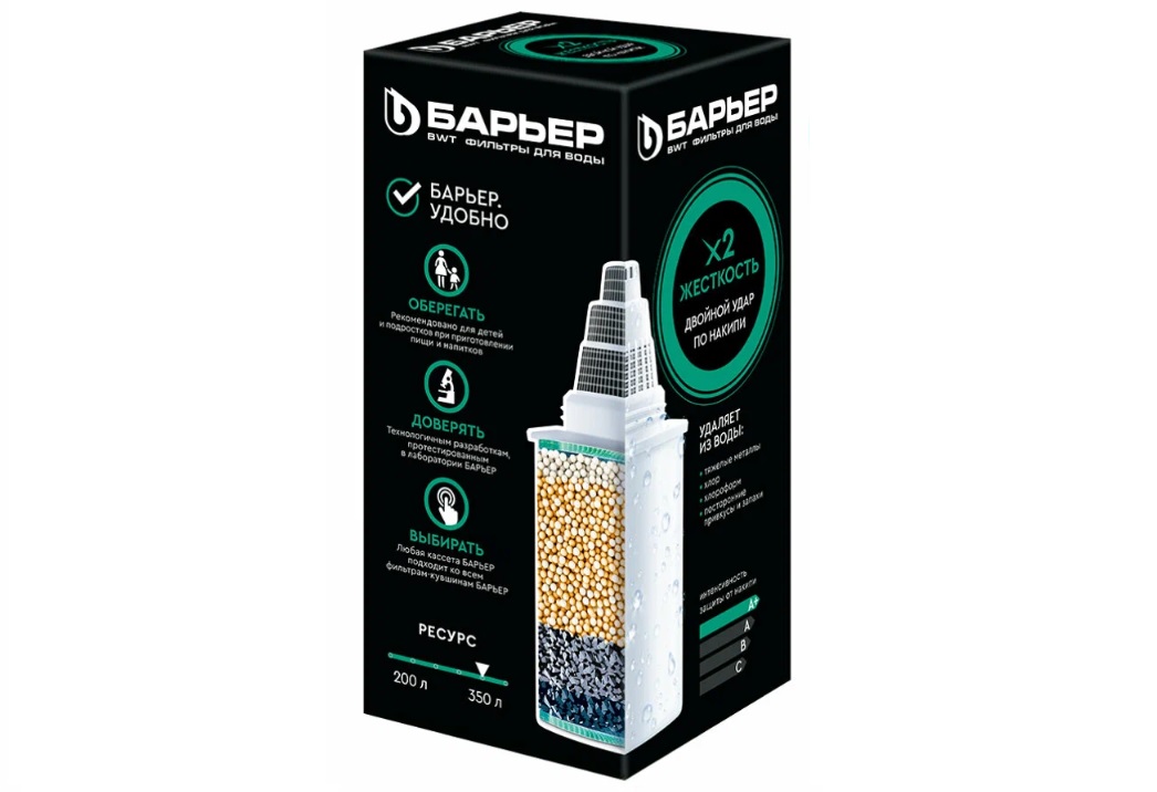 Кассета Жесткость и Железо. Комплексная очистка водопроводной воды от накипи, ржавчины, хлора и других вредных примесей, предотвращает накипь, удаляет посторонние привкусы и запахи, ресурс кассеты 350 литров, подходит для всех кувшинов барьер.