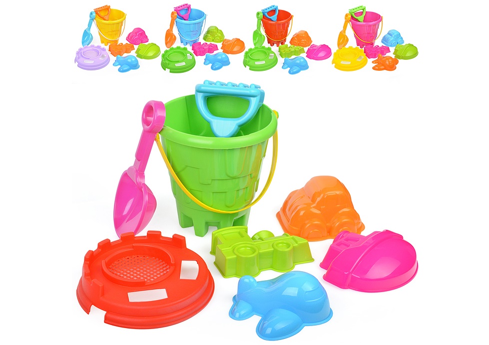 - Песочный набор №9 НП09 ведро, ситечко, совок, грабельки, 4 формочки