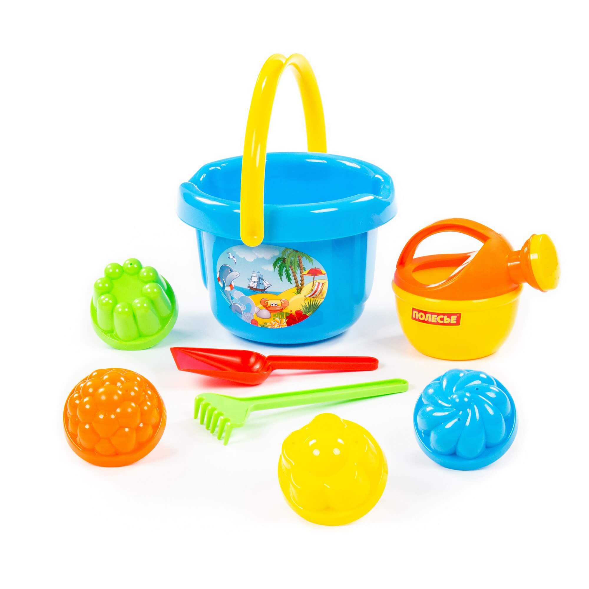 Песочный набор №10 0989 ведро, ситечко, лопатка, грабельки, 4 формочки