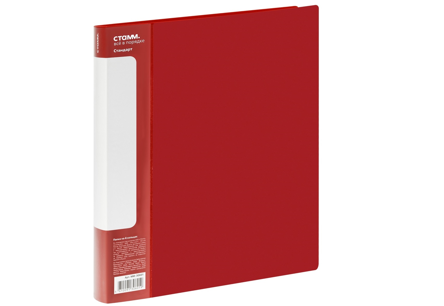 - Папка 4 кольца СТАММ ММ-30601 "Стандарт" А4, 25мм, 700мкм, пластик, красная