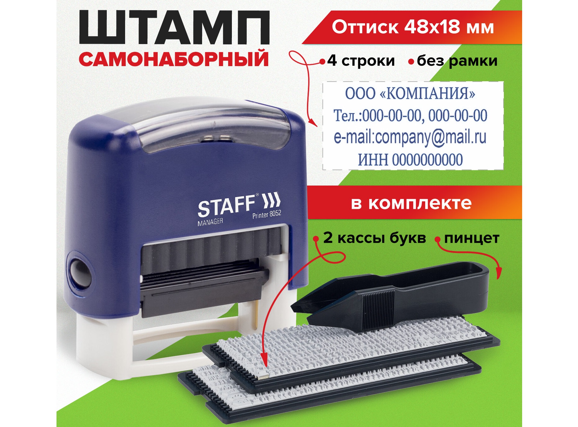 - Самонаб. штамп 4-стр. STAFF 237424 оттиск 48х18 мм, "Printer 8052", КАССЫ В КОМПЛЕКТЕ