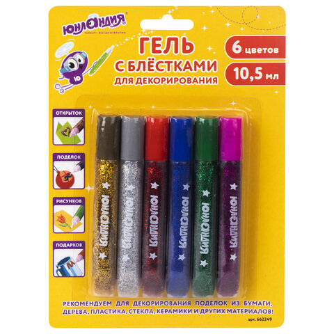 Гель 6 цв. ЮНЛАНДИЯ 662249 с блестками, для декора, поделок, DIY, творчества, оформления, по 10,5 мл, блистер
