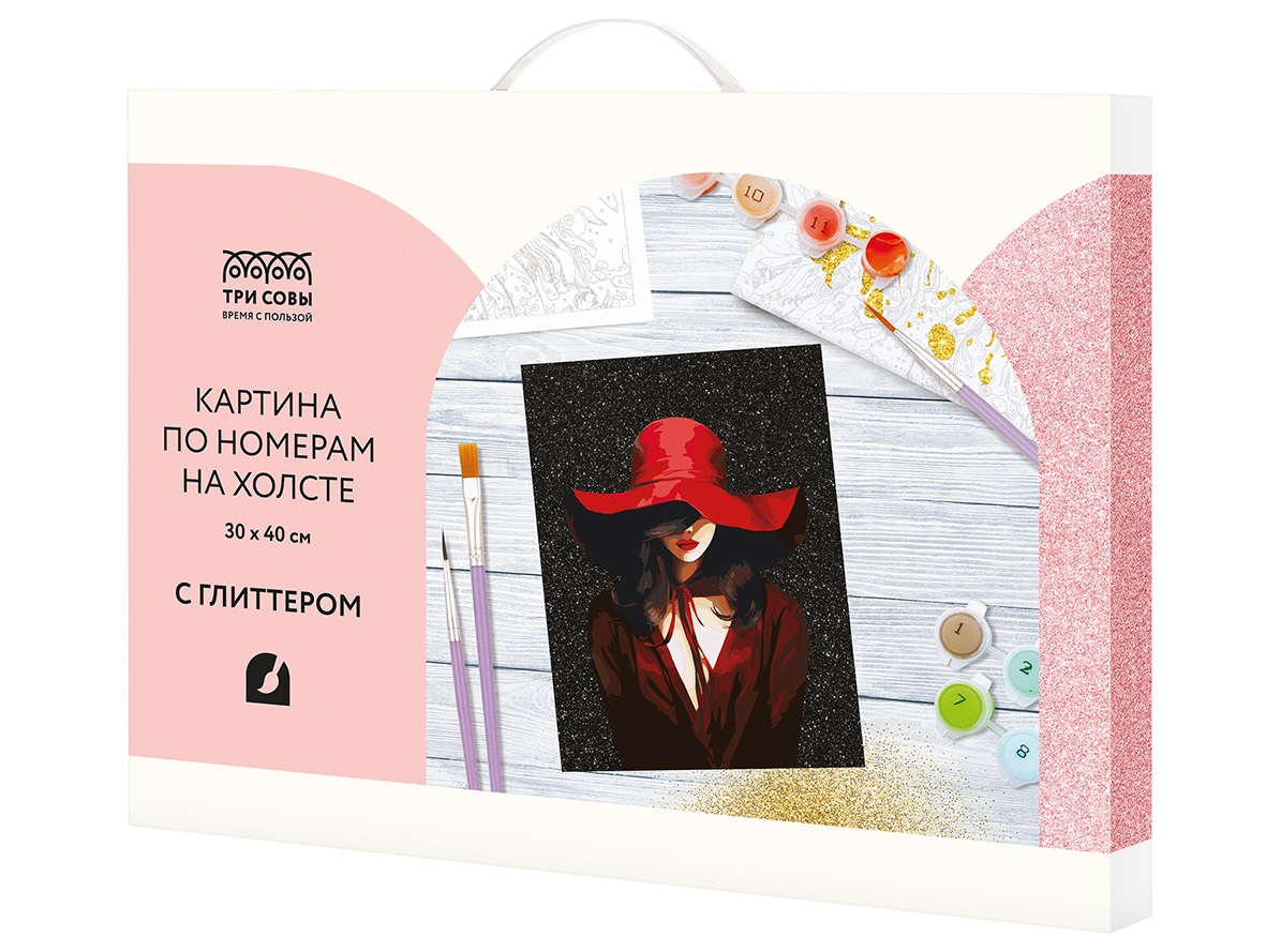 - Набор для раскрашивания по номерам ТРИ СОВЫ КХг3040_57053 с глиттером "Девушка в красном", 30*40, с акриловыми красками и кистями