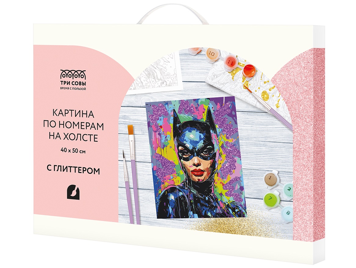 - Набор для раскрашивания по номерам ТРИ СОВЫ КХг4050_57065 с глиттером "Женщина-кошка", 40*50, с акриловыми красками и кистями