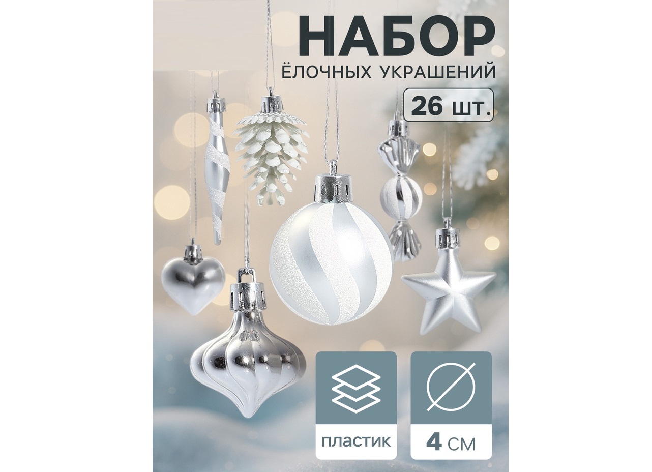 Набор новогодних украшений 10870239 Праздничный хоровод серебро 26шт